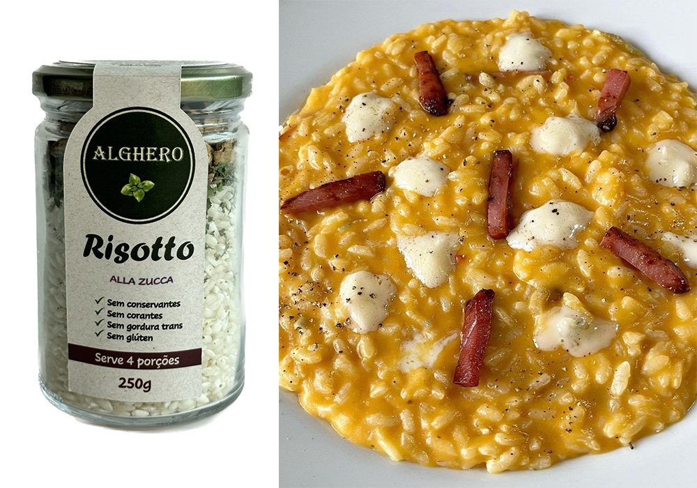 Ingredientes: arroz arbório; abóbora (zucca), cebola, alho, salsa e caldo de legumes (desidratados), sal do himalaia e pimenta do reino.